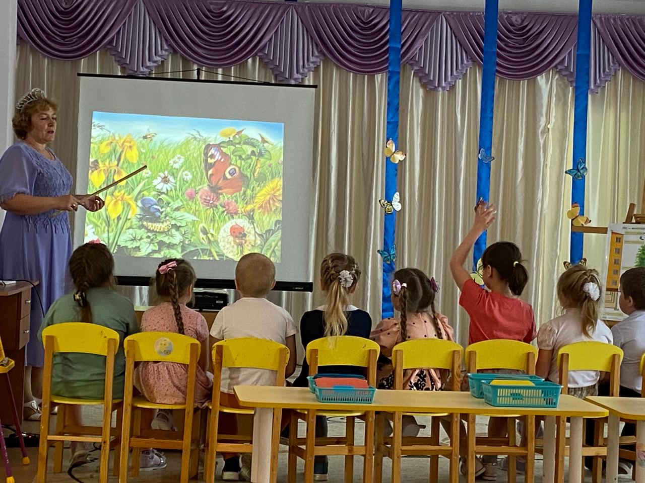 Педагог Курбанова М.А. провела занятие на тему: «Путешествие по экологии с элементами математики». В образе сказочной Феи она знакомила детей с многообразием природных объектов-лес, луг, водоем, акцентировала внимание детей на грамотном поведении в природе.