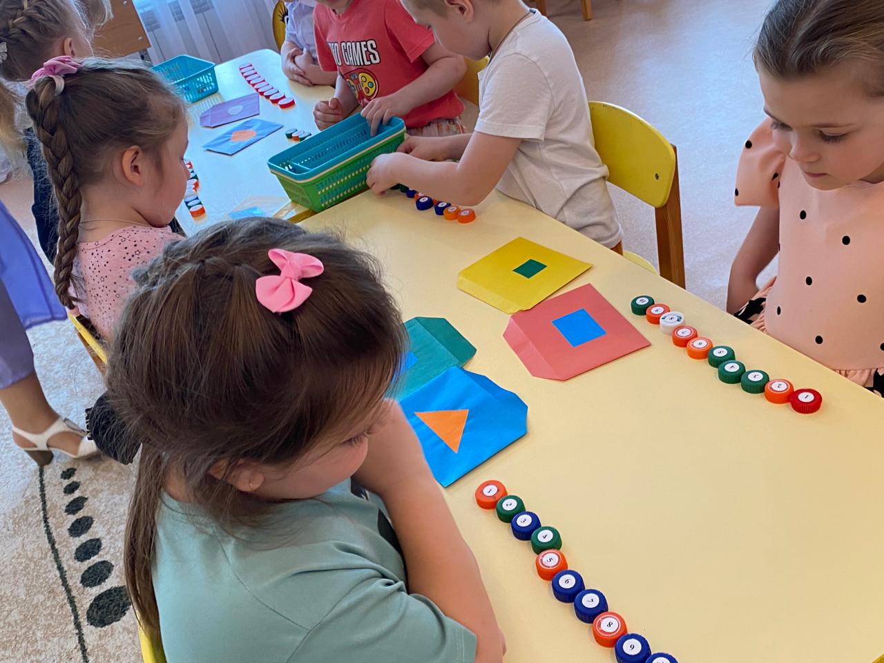 В игровой увлекательной форме педагог закрепляла знания детей о геометрических фигурах, умение составлять числовой ряд, считать в пределах 10 ( туда и обратно). Хорошо ребята справились с решением задач, примеров.